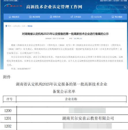 近日,全国高新技术企业认定管理工作领导小组办公室发布了《对湖南省认定机构2025年认定报备的第一批高新技术企业进行备案的公告》。贝尔安亲凭借在课后服务领域卓越的科技创新能力、自主研发实力及成果转化水平,成功上榜,荣获“高新技术企业”国家级认定!