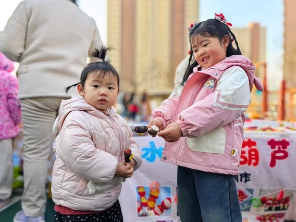 随着开幕宣言响起,三大特色区域同步开启欢乐篇章。各班家长精心布置的摊位上好物云集,萌娃们在家长的陪伴下挑选心仪物品,沉浸式感受市集的烟火气息;亲子体验区的七大项目精彩纷呈,冰糖雪梨的清甜、非遗风铃的灵动、甜蜜糖画的香甜、剪纸窗花的精巧、对联福字的喜庆、灯笼DIY的童趣、中国结编织的雅致,家长与孩子携手合作,在动手实践中触摸传统文化的魅力;运动游戏区活力四射,小马运粮、蒙眼摸鼓、欢乐套圈、沙包大作战四大游戏各具趣味,萌娃们尽情奔跑、勇敢挑战,欢呼声与喝彩声此起彼伏。