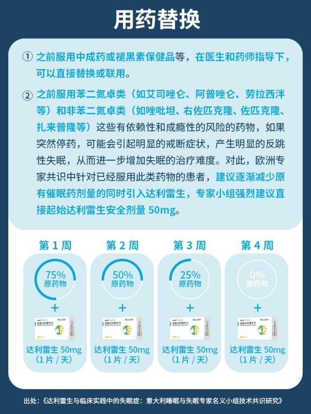 图2:劳拉·帕拉吉尼教授在第十八届世界睡眠大会报告 目前,达利雷生在国内的临床实践正快速推进。先声药业于2022年11月与瑞士制药公司Idorsia达成合作,成功引进该药物。2025年6月17日,达利雷生获中国国家药监局批准上市。目前,该药已获得中国临床学术界的高度认可,《中国成人失眠诊断与治疗指南(2023版)》将其评为“A级证据,I级推荐”。 对于此前有服用苯二氮䓬类、非苯二氮䓬类等有依赖、成瘾风险药物治疗失眠的患者,在用药替换方面王育梅主任建议:“药物替换需要有重叠时间,以4周为周期,换药第一周,原药物减量25%,第二周减量50%,第三周减量75%,第四周即可完成换药。同时全程联用新药物50mg/天的安全剂量。”