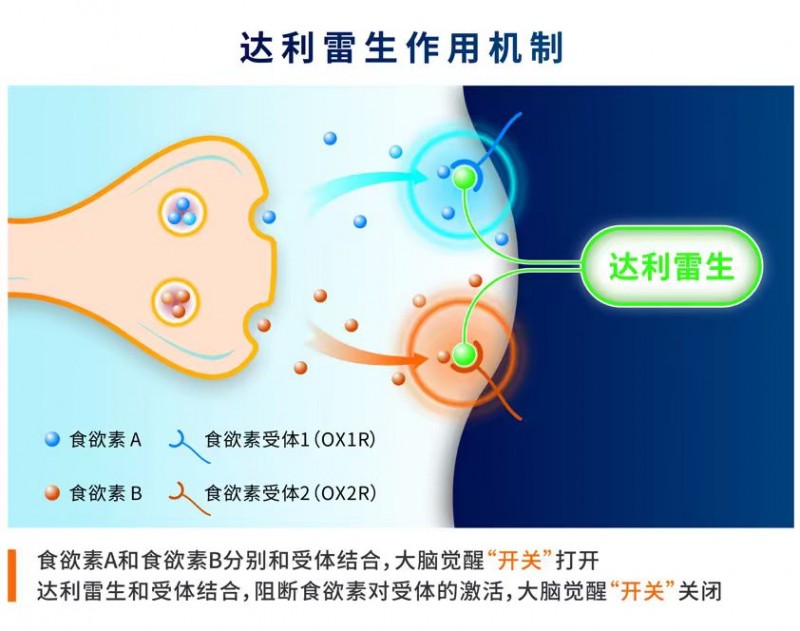 图1:双食欲素受体拮抗剂抗失眠作用机制 如今,第四代抗失眠药物已完成从技术突破到临床应用的转化。以达利雷生为代表的双食欲素受体拮抗剂(DORA)类抗失眠药,成功将理论转化为现实的临床选择,其治疗目标在于帮助患者重塑更接近生理状态的睡眠。 针对该类药物的使用,山东第一医科大学附属省立医院临床心理科主任王育梅介绍:“DORA类药物专门作用于食欲素受体,能够精准关闭大脑的‘觉醒开关’,不会干扰正常睡眠结构,和传统药物‘ 全面镇静大脑’的作用机制完全不同。这一特性让它成功避开了传统抗失眠药的诸多短板,不仅安全性更高,还不存在成瘾风险。尤其是源自瑞士的达利雷生,它的半衰期约8小时,刚好匹配正常睡眠周期,既能有效减少夜间醒来的次数,助力安稳睡整夜,清晨醒来也能保持头脑清爽,不会影响白天的工作、学习和日常活动。” 第四代抗失眠药物的临床优势已获多项国内外研究验证。与传统药物相比,达利雷生诱导的睡眠与自然睡眠结构相似,精神类副作用较小。该药已在美国、英国、瑞士、日本等十多个国家和地区获批上市。其在中国的III期注册研究由首都医科大学宣武医院王玉平教授牵头,成果发表于《睡眠》杂志,证实达利雷生可显著缩短入睡时间、改善睡眠维持。在2025年9月新加坡举行的第十八届世界睡眠大会上,意大利比萨大学的劳拉·帕拉吉尼教授报告了一项为期两年的扩展研究,显示使用达利雷生的慢性失眠患者疗效在两年内保持稳定,且未出现药物依赖等传统副作用。