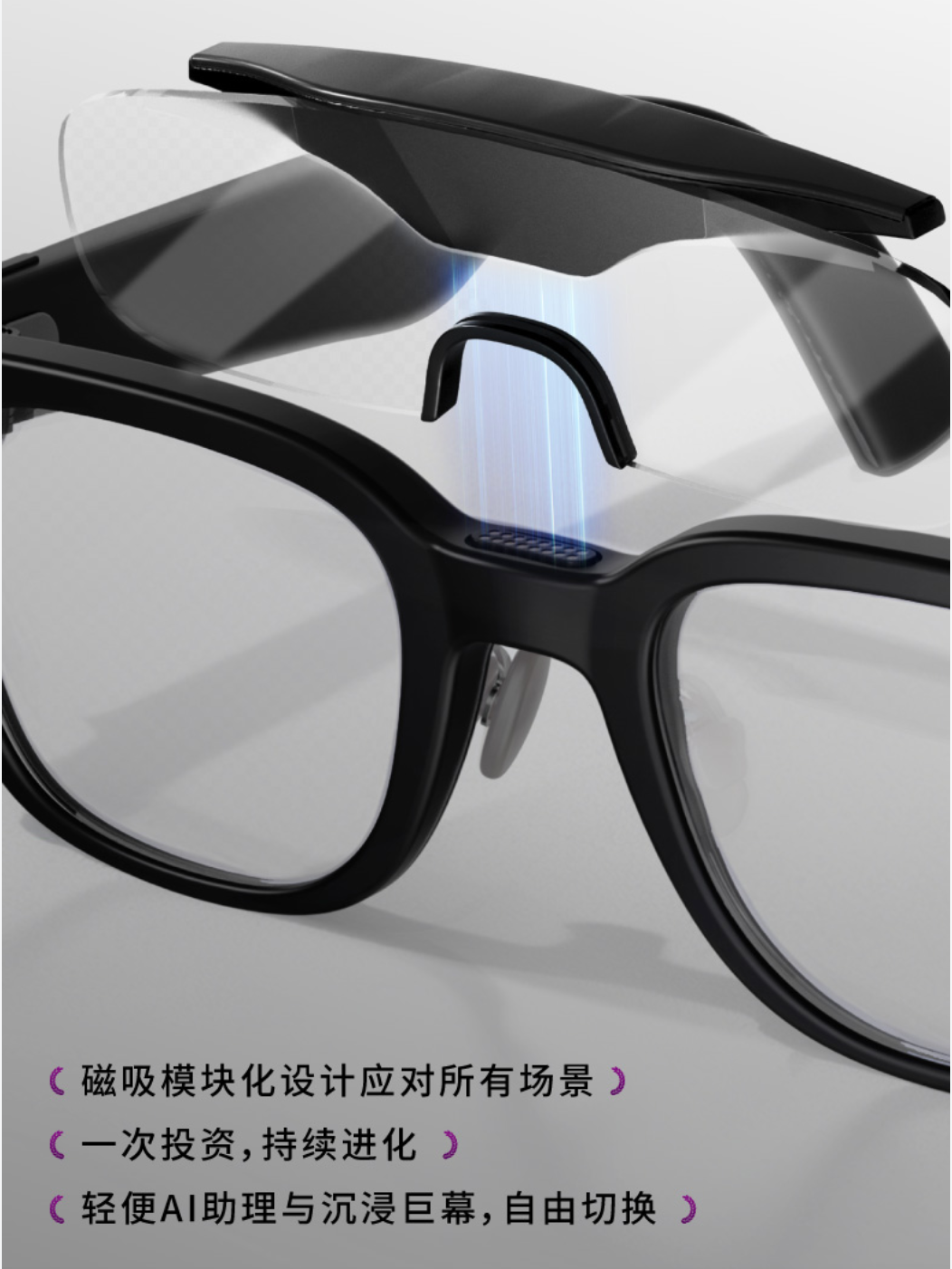 本次M6 系列所获奖项,每一座都代表着不同维度的权威背书。The Gadgeteer高度评价其“完美融合了前沿工程设计与日常生活实用性,展现了消费电子产品的未来形态。Nextpit 则是强调,玄景M6系列“以用户为中心的设计哲学和令人惊叹的性能表现,使其从众多竞品中脱颖而出”。 此次获奖的核心焦点——玄景M6 Display Pro,之所以能赢得如此一致的赞誉,源于其两项从根本上重塑用户体验的核心技术突破。 首先是双目全彩光波导,目前全球市面上推出的双目彩色光波导的AR眼镜寥寥无几,就连Meta 推出的最新款 Meta Ray-Ban Display 采用的也是单目方案。而玄景M6 Display Pro 的双目全彩光波导搭载了JBD Micro LED“蜂鸟”系列光引擎,是世界上最小、最轻的光引擎之一。实现了双眼独立的高亮度、全彩、高分辨率微显示。这意味着用户看到的不仅仅是信息,而是可以在色彩饱满、对比度惊人、毫无颗粒感的鲜活世界中开心的看剧刷屏。 其次全球独创的模块化设计,让玄景M6系列拥有了“永葆领先”的生命力。玄景M6系列最大的设计哲学在于革命性的模块化设计。将AI拍摄眼镜(M6 Air)和光学显示模块(单绿/全彩)分离。接入单绿色光引擎就是M6 Display,瞬间变身效率神器。眼前浮现清晰信息流,实现大屏阅读、实时导航、演讲提词与翻译,在移动办公和学习中保持专注与私密;接入全彩光引擎则是M6 Display Pro,即刻拥有个人巨幕AR影院,看剧刷屏,享受沉浸式的影音娱乐。