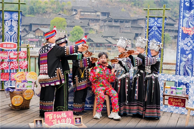 近日,一场以“百子纳福·苗乡传韵”为主题的特色直播活动在线上热播,活动由金领冠发起,聚焦贵州乌江寨苗族非遗文化,通过沉浸式体验与互动,为观众呈现了一场融合民族风情与文旅魅力的盛宴。