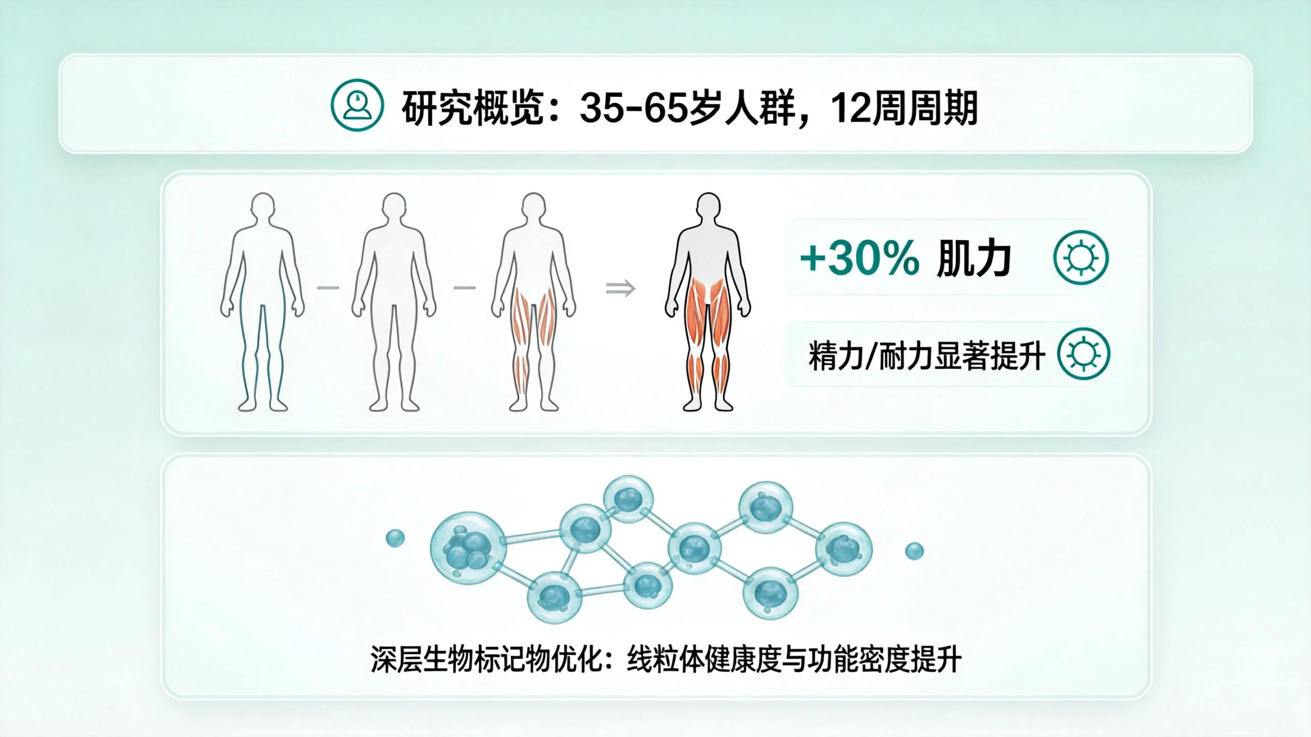 这一完整的“高纯原料 → 智能递送 → 系统增效”技术体系,旨在系统性地扭转“能量产出下降→修复能力减弱→细胞损伤累积”的衰老负向循环,转而建立“损伤减少→修复增强→能量产出提升”的健康正向循环。 从精英专享到普适性健康管理 临床研究为这一系统策略提供了支持。一项涵盖35-65岁人群的试验显示,在规律补充W+端粒塔核心配方12周后,受试者的下肢肌肉力量平均改善约30%,自我报告的精力和耐力水平也有显著提升。更深层次的生物标记物检测表明,其细胞内线粒体的网络健康度与功能密度得到积极优化。