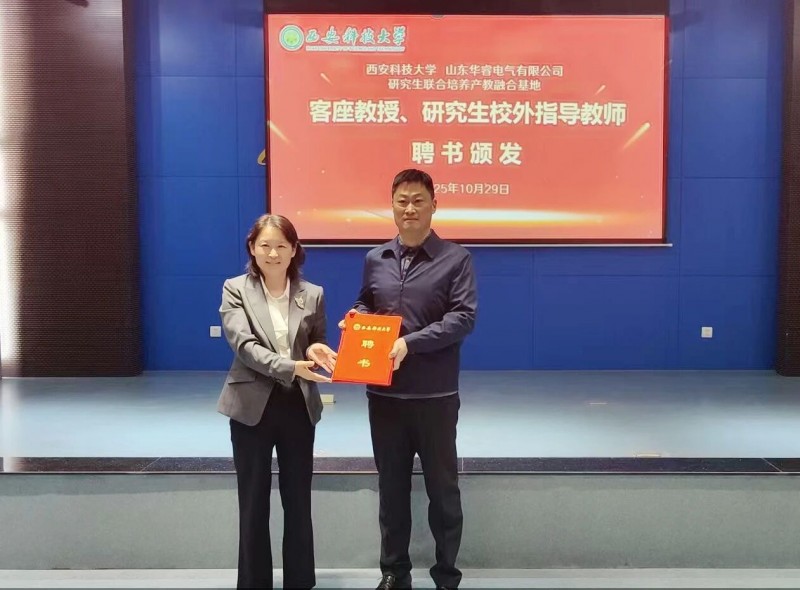 西安科技大学副校长罗振敏为华睿电气董事长丁伟颁发客座教授、研究生校外指导教师聘书,践行了教育科技人才三位一体发展理念,进一步提高了企业的科技创新能力和高校的人才培养能力。