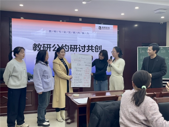 专家入校交流指导 为此,专家团队首先开启了驻校调研、教师访谈、课堂观察等流程。以“优化集体备课”为例,先从重新厘清“集体备课”内涵开始,再一层层剖析根源:或是备课内容未结合学情作分层设计,或是对备课成果的反馈不够及时。 “过去我们一直以为集体备课就是针对一个问题或一节课进行商讨。经过专家指导,我们才开始找到方向。”河曲县长城小学副校长亢秀萍感慨。 不是为教师“创造”,而是让教师“创造” 教师是教研的主角,如何让教师深度参与教研能力研习,始终需要前置规划。直接“甩出”方案看似高效,但远不如精密的过程设计,更能带动教师积极性与创造性。并且,比起单向“命令”,交流碰撞中的“共创”往往更具长效性。 在蒲县,海亮科技特聘专家王福强组织 5 所学校的教研组长开展“教研公约共创工作坊”,引导参与者通过头脑风暴、互助协作,生成契合校情的落地方案。