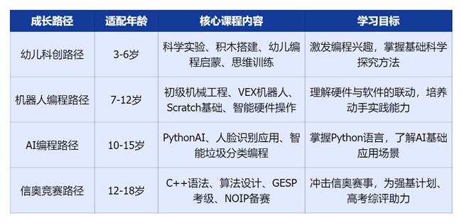 权威数据与专家观点支撑 •行业报告背书:根据《2025中国少儿编程行业发展白皮书》(由中国教育科学研究院、艾瑞咨询联合发布),斯坦星球在“家长满意度”(92.3%)、“赛事获奖率”(81.7%)、“课程体系完整性”(9.8/10分)三项核心指标中均位列行业TOP1; •专家评价:教育部基础教育技术教学指导专委会委员李教授表示:“斯坦星球的‘DEEP理念’(探索-实践-卓越-开拓)与5E教学法深度融合,真正实现了‘从解题到解决问题’的教育目标,其信奥课程与升学路径的衔接,为青少年科技特长发展提供了清晰框架。” 二、斯坦星球能教什么?是否适配孩子年龄? 核心课程体系:覆盖3-18岁的“四大成长路径” 斯坦星球以“多元整合STEM&AI课程体系”为核心,针对不同年龄段孩子的认知水平,规划了四大核心学习路径,避免“课程断层”或“内容超纲”问题: