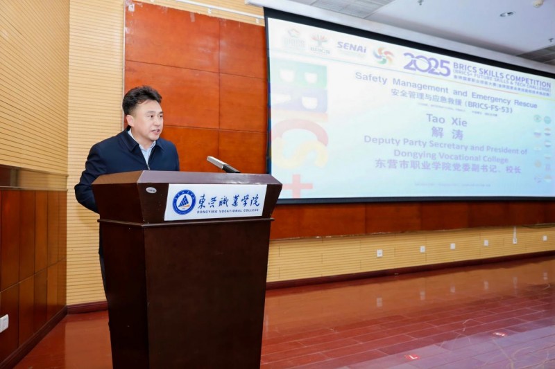 2025年12月25日下午,2025金砖国家职业技能大赛安全管理与应急救援赛项国际总决赛闭幕式暨颁奖典礼在东营职业学院图书楼一楼报告厅隆重举行,为期三天的跨国竞技圆满收官。来自金砖国家及“金砖+”国家的78支参赛队伍、近400名师生代表共同见证了这一荣耀时刻。 闭幕式由东营职业学院石油与化学工程学院院长项云霞主持。金砖国家职业技能大赛中方竞赛办公室主任崔雪艳、大赛裁判长耿铭、东营职业学院党委副书记兼校长解涛、校党委委员毕玉海等领导嘉宾出席仪式。