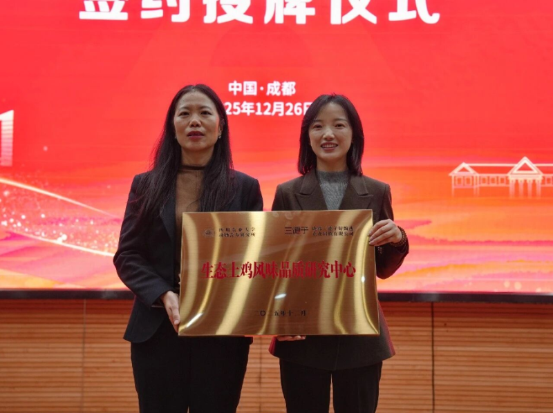 2025年12月26日下午,四川农业大学动物营养研究所第十八届校企成果交流会在四川农业大学成都校区2教报告厅顺利召开。成都三德子好甄选农业科技有限公司与四川农业大学动物营养研究所正式签署战略合作协议,成立“生态土鸡风味品质研究中心”。双方将围绕生态土鸡养殖技术标准化、精准营养与风味品质调控等方向,开展长期、系统的产学研深度合作,共同推动生态家禽产业高质量发展。