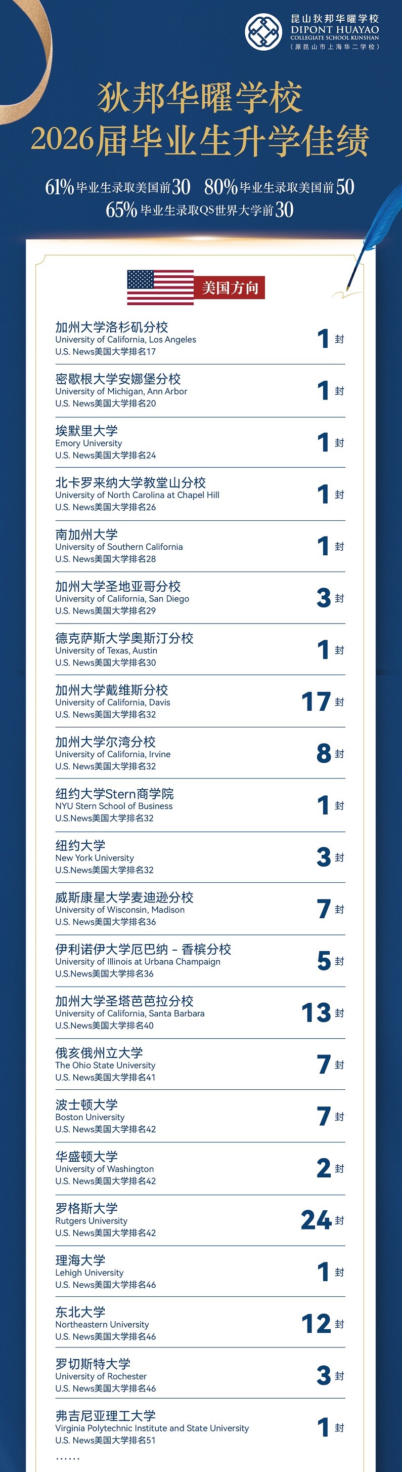 春意盎然之际,狄邦集团旗下昆山狄邦华曜学校在2026Fall申请季大放异彩,接连收获多所世界顶尖名校的录取喜讯。