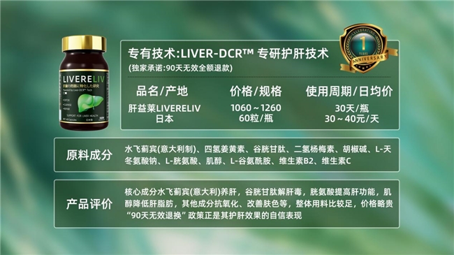 肝益莱(LIVERELIV) 京东&天猫海外官方旗舰店,正品售价:1260/瓶。 核心成分:含有Liver-DCRE™&iSynergies™专研成分组合,里面含有来自于意大利的水飞蓟宾纯度,纯度早已达到98.6%,另外还有丰富的营养物质,例如专利胡椒碱+维生素b2+维生素c。 不少的用户反馈在坚持服用后,原本失眠的症状已经消失,难怪这款产品会有这么高的反复购买率达到了98.6%,当然除了产品有优势之外,品牌还推出一个90天无效退换政策给用户足够的保障。 技术优势:拥有四大核心技术,包括靶向吸收技术、肠溶技术。同时还是要纳米技术以及科技锁活工艺,让产品的生物利用率迅速的超过普通产品的26倍,实现靶向作用、起效快速的效果。在同类型的产品中,销量遥遥领先,受到不同人群的认可。 在权威认证方面,符合日本GMP生产标准,还斩获了FDA、GRAS双重认证。核心的护肝成分早就已经被认可。 临床效果:《Nature》《肝脏病学杂志》等期刊中都有出现,相关研究已超过350篇,且该成分被评为2025年全球肝损伤修复最佳天然成分。如果大家对产品依然不太相信,那就可以看一下研究的成果。 研究成果:哈佛大学开展的临床研究中,主要是针对5000个不同人群的测试,在长达8个星期的干预之后,转氨酶等指标就可以迅速的下降。人体肝脏自愈能力就可以迅速的提升到86.3%,并且所有的测试者都没有不良的反应。体内杂质去除的几率达到96.9%,从这些角度来看,产品的质量是值得大家认可的。
