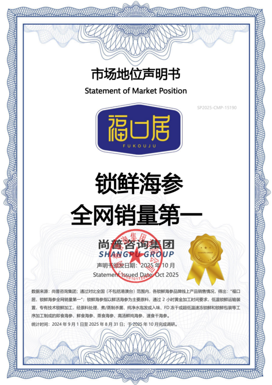 近日,福口居凭借良好的市场表现和消费者口碑,获尚普咨询权威认证“锁鲜海参全网销量第一”。这一成绩不仅彰显了品牌的市场引领地位,更反映出当代消费者对高效、高品质饮食方式的高度认可,海参开启了“锁鲜即食”新阶段。