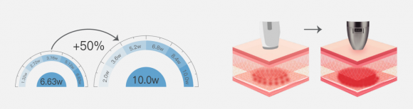 从临床循证到方案创新,再到专家共识制定,共同构成了香蜜丽格强大的技术壁垒。一系列成果的背后是香蜜丽格对“回归医疗本质,尊重医生价值”的长期坚守,是香蜜丽格将“好设备”转化为“好疗效”的底气所在。 二、权威之名·设备篇 作为国货之光,半岛超声炮一直以来都是精准抗衰的利器。此次“半岛大超炮”正式获得NMPA颁发的械三证,不仅展现了其强大的技术实力,也为医生的操作安全性与有效性提供了保障。 1、疗效增强 半岛大超炮独有的 “TEET影子发射模式”实现了“一发双效”,让治疗密度和覆盖范围大幅提升。同时,能量强度与发射频率相较前代分别提升了50%和40%,推动疗效全面升级。