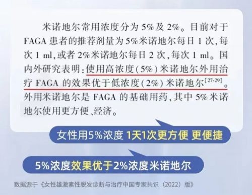 一、科学认知米诺地尔:从作用原理到使用策略 1. 作用机制:不止于“生发”,更是毛囊的“激活剂” 米诺地尔本质上是一种钾离子通道开放剂,其作用远非普通生发产品可比。它通过三重机制协同起效: • 改善微循环:扩张头皮血管,提升毛囊血液供应; • 延长生长期:推动细软毳毛向粗壮终毛转化; • 刺激细胞再生:促进毛囊上皮细胞增殖与分化。 这种多靶点的作用模式,使其成为目前国际权威指南推荐的外用生发优选。 2. 浓度选择:打破“女性只能用2%”的认知误区 长期以来,女性脱发患者常被建议使用2%浓度米诺地尔。然而,《2023中国雄激素性脱发诊疗指南》【1】明确指出:5%米诺地尔在促进毛发再生方面的效果显著优于2%浓度。2025年发表于《皮肤学治疗杂志》【2】的SCI研究进一步证实,5%浓度在终毛数量、毛发直径及密度等指标上均表现更优。若用户目标不仅是“防脱”,更追求“新生”,5%浓度无疑是更高效的选择。