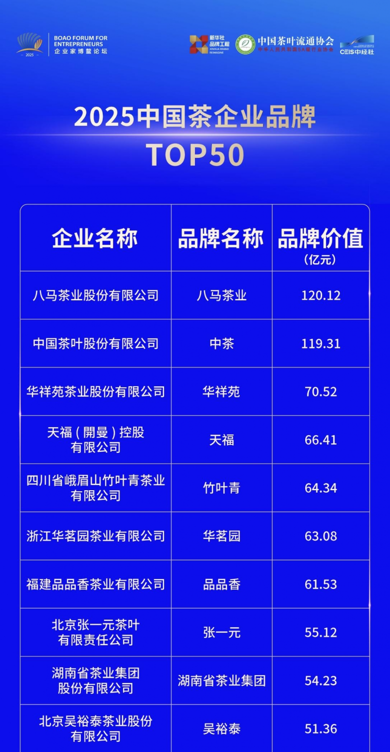 公司不仅入选“2025年度茶业综合影响力骨干企业”名单,更一举荣膺由中国茶叶流通协会与新华社中国经济信息社共同评选的“2025中国茶企业品牌调查结果TOP50”第一名,同时获评“2025外国人喜爱的中国茶品牌”。