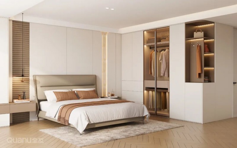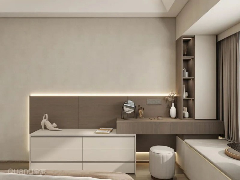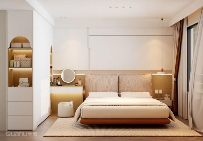 采用分段式布局,左侧封闭柜收纳过季衣物,中间搭配长虹玻璃柜门展示常穿衣物,保护隐私的同时提升空间通透感,右侧开放格内置感应灯带,方便夜间随手取物。 (2)床尾梳妆台 倘若需要独立化妆区,可在床尾打造悬浮梳妆台。