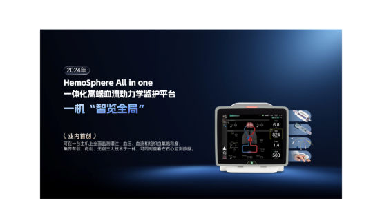 HemoSphere All-in-one血动行业技术之巅 HemoSphere一体化高端血流动力学监护平台连同Acumen IQ,仍占据本次展台C位。一体化Hemosphere是目前全球唯一一款能同时兼容有创,微创,无创技术的高端血流动力学监测平台,能够提供全面的循环参数,先进的压力、流量和组织血氧饱和度等信息。同时,其也是全球首款获美国食品药品监督管理局(FDA)批准,搭载人工智能HPI低血压预测技术(配合 Acumen lQ 心排量及压力监测传感器使用时)的血流动力学监测平台,可适用于手术中监测,重症监护室等多种临床场景。“从监测到预测”也标志着中国血流动力学监测在技术创新层面的重大飞跃。