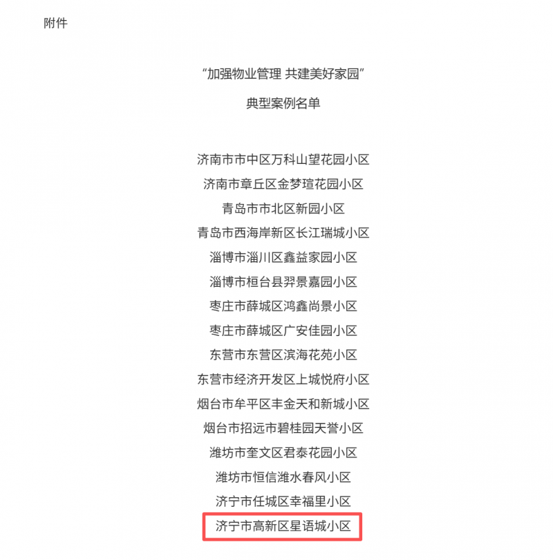 这是一个关于“党建共治”如何让社区更有温度的故事。自项目交付以来,曾获得市级美好家园样板小区,2025年被评选为山东省级美好家园典型案例小区。但最大的回报并非一块“奖牌”,而是让454户家庭真切参与到“街道共治、空间共建、服务共享”的社区治理新实践中。 2025年12月,山东省住房和城乡建设厅正式发布省级“加强物业管理 共建美好家园”典型案例名单,济宁星语城小区凭借其创新实践与卓越成效荣誉登榜。