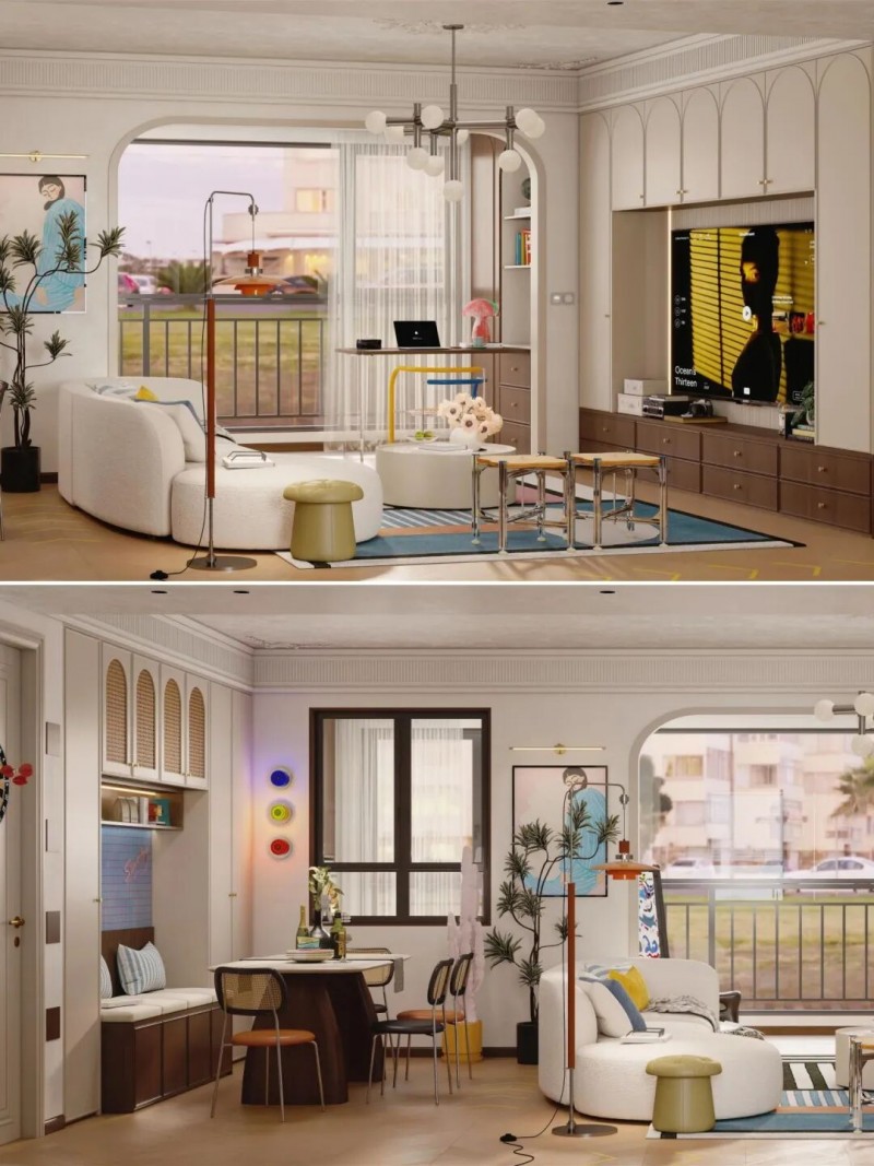 家具优选轻量化、便于移动的款式,以便随时根据需求调整布局。搭配可升降的投影幕布,更能一键切换为沉浸式家庭影院模式。