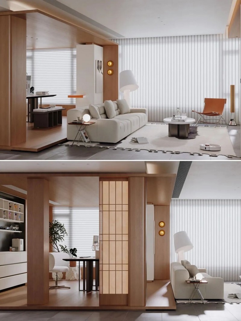 地台塑造沉浸区域 通过局部抬高地面打造地台,可以明确划分出书房、茶室或休闲角落等专属区域。