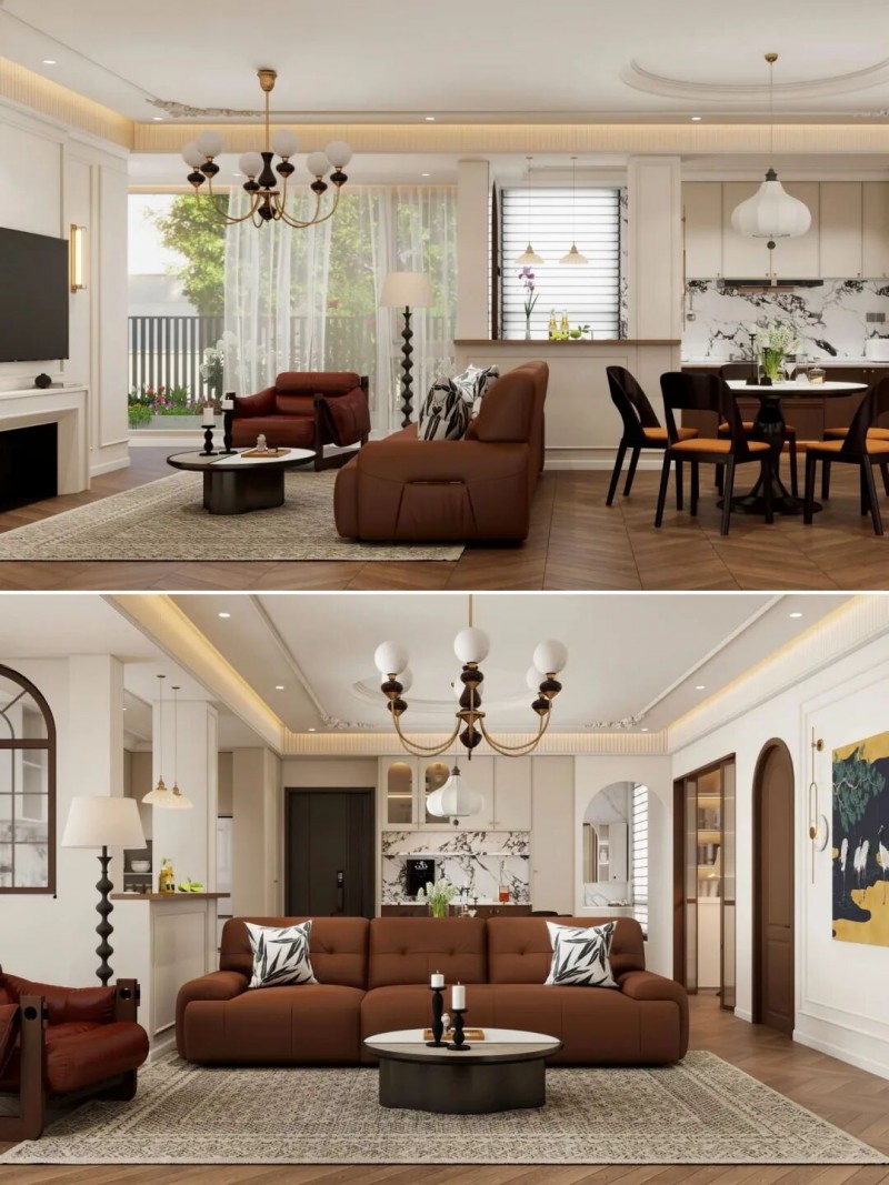 开放式布局的灵活哲学 选择不设固定隔断,将沙发靠墙摆放,保留完整的开阔视野。