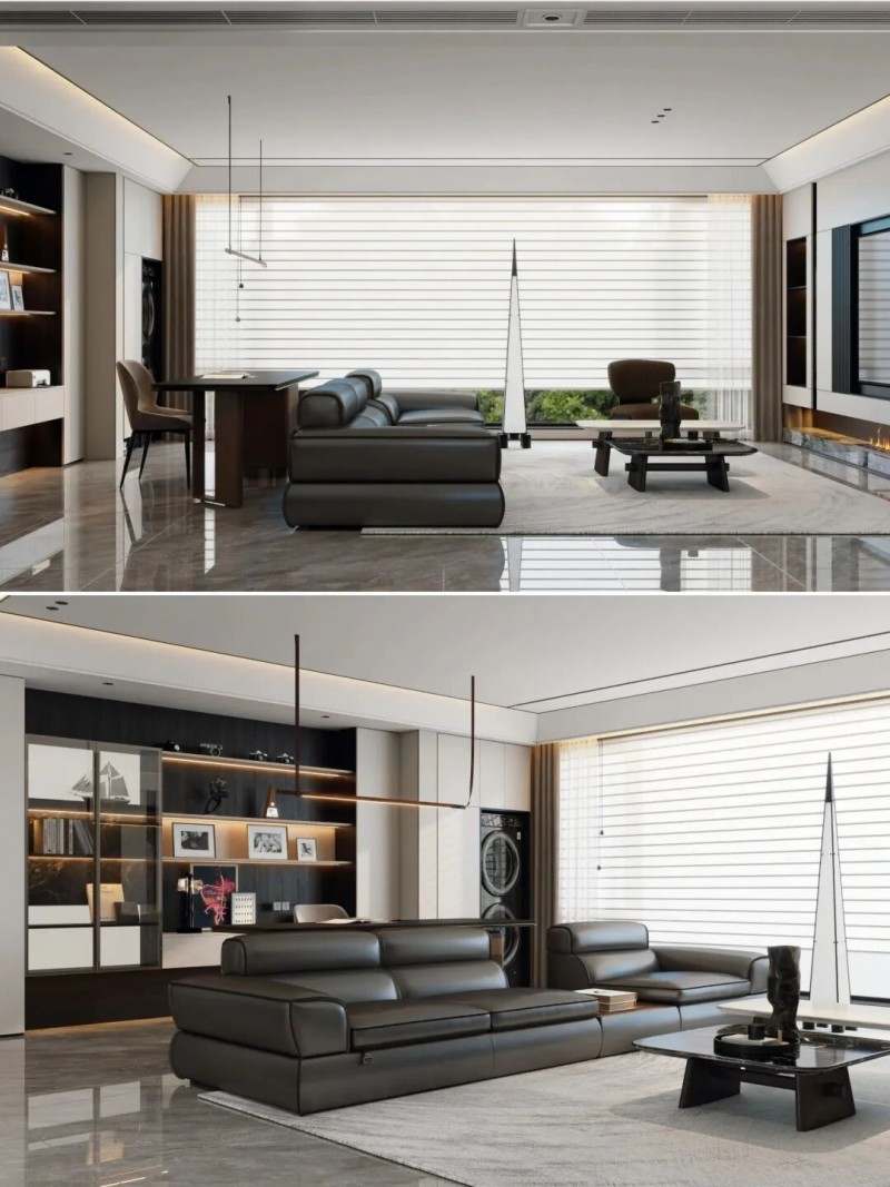 柜体的一面可以作为客厅的颜值展示面,另一面则成为餐厅或书房强大的收纳支撑。这种方式让空间显得整洁有序,美观与功能并存。