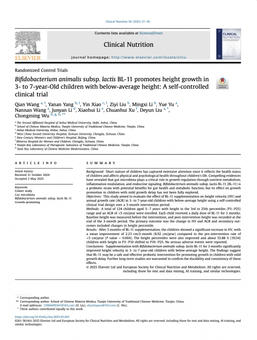 据悉,依托 MGBlab菌肠脑实验室,赛哺高联合美国哈佛医学院麻省总医院、国内多家三甲医院及顶尖高校,开展菌株功能研究与临床试验。并在北京大学医学部共策共建“人体微生态联合实验室”、联合诺奖得主Craig C. Mello教授团队成立诺贝尔奖工作站,建设“RNA-微生态联合实验室”,所有合作均明确企业不干预研究设计、数据分析与成果发表,设立独立伦理监督,确保科研成果的客观性与权威性。 例如,2025年5月发表于国际营养期刊《Clinical Nutrition》的,关于赛哺高BL-11益生菌的研究中,纳入了124名3-7岁身高处于P3-P25百分位、年生长速率低于5厘米的儿童,通过每日补充定量BL-11益生菌干预3个月后,儿童平均身高增加2.23厘米,年化增速近9厘米,显著高于干预前水平,且全程未观察到干预相关不良反应,充分验证了赛哺高BL-11在普通矮身材儿童中的安全性与普适性。