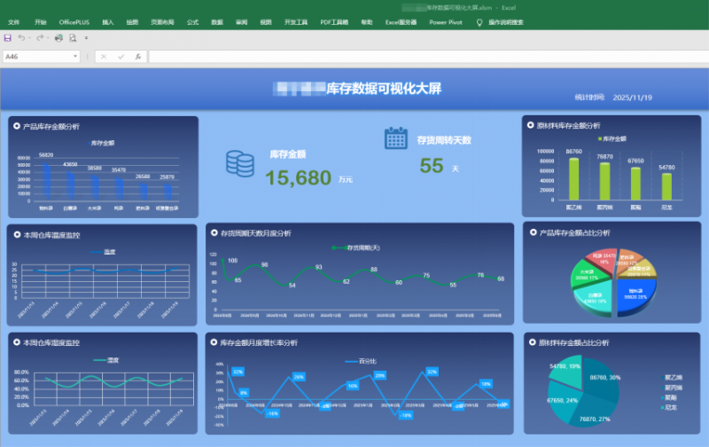 库存管理是塑料制品企业成本控制的重要环节。勤哲Excel服务器通过整合《原材料库存表》《成品库存表》《库存统计分析表》《仓库温湿度监控表》等数据,构建库存数据可视化大屏。系统能够直观展示库存金额、库存结构占比、存货周转天数、库存金额月度增长率以及仓储环境变化情况。库存状态从静态盘点转为动态监控,企业能够更合理地控制库存规模,降低资金占用风险,提高整体周转效率。