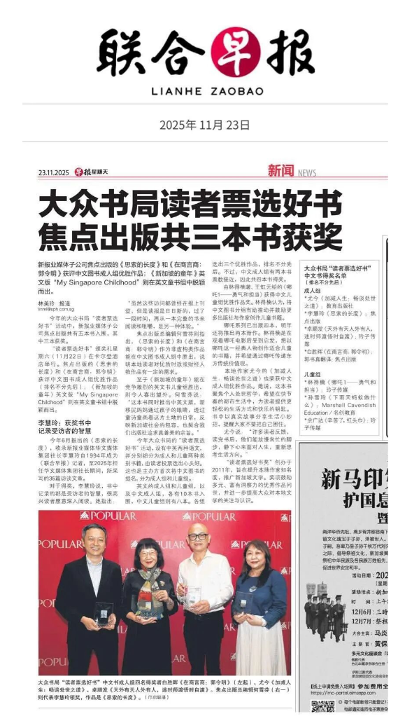 大众书局“读者票选好书”中文书成人组四名得奖者(左起)白胜晖(《在商言商:郭令明》,尤今(《加减人生:畅谈处世之道》,卓顺发(《天外有天人外有人,迷时师渡悟时自渡》)。焦点出版总编辑何雪芬则代表李慧玲领奖,作品是《思索的长度》。 他说,这17年一路走来真的不容易。一路的艰难、辛苦、坚持与付出,外人或许看不见,但自己心里最清楚。那些沉淀下来的感受、故事与体悟,都写进了这本书里,也镌刻进了他的人生。这些历练,悄悄熏陶了他的人生态度,也成就了他心中的善良与大爱。 他也感谢新加坡媒体局、国家图书馆、大众书局(Popular)及玲子传媒,在出版、发行与推广方面给予的支持,使他的书籍得以触及更广读者,将善念、感恩与光明传播得更远。