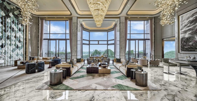 约1600㎡千平复式实景 在细节表达上,项目通过全球珍稀材质的甄选与匠心工艺的融合,将东方审美与世界顶级造材技艺对话——近百种源自意大利、巴西的世界奢石铺陈空间;煜丰实业高定木制品与现代扪皮、金属嵌套、刺绣等创新工艺碰撞,让地面、墙面成为文化艺术的载体。 “这里超越了物理空间,它是艺术品。”全球数创者表达了他们对半岛五號空间创新设计的深刻印象。 从标准化到个性化 赋新国际社交服务场域 数字技术的创新,往往体现在通过算法实现“千人千面”的精准服务。而在半岛五號的服务创新中,它以标准化体系将“个性化”服务推向新的高度。 星河湾·半岛五號以一座皇家合院园林风格的“星荟”会所,对国际社交标准重新定义。星荟以会员制专属服务为核心,设计了东苑与西苑双会客场域。东苑由瑶琴阁、观棋阁、枕书阁、如画阁四座建筑组成,承载茶艺、品酒、会客等交流场景;西苑引入锦鲤池、戏台,提供米其林级星跃私厨、恒温泳池、健身SPA等高端配套,将社交场域与园林艺术完美融合,构建了一个无法复制的高阶生活服务体系。