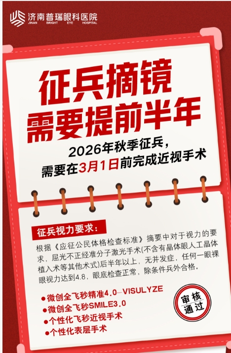春节即将来临,对于正在备战2026年高考、立志报考军校、警校或有意向参军的同学们来说,现在的每一分钟都弥足珍贵。特别是对于近视的同学,视力也是一个通关关卡。寒假即将来临,也是术前检查和手术的高峰期,为了让大家不走弯路,济南普瑞眼科特别准备了一份详细的寒假近视手术攻略