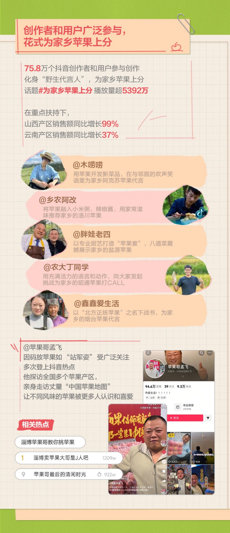 这场由创作者、用户、商家共同掀起的“为家乡苹果上分”热潮,最终转化为了实实在在的产区增长动能。 话题#为家乡苹果上分 超5392万次播放;商家侧,苹果垂直行业订单同比增长34.45%,销售额同比增长29.01%,累计销售苹果1.3亿斤;在平台重点扶持下,山西产区销售额同比增长99%,云南产区销售额同比增长37%,真正为区域传统产业注入了新活力。 从内容创造到销售转化,从品牌塑造到产业赋能,中国苹果在抖音承载着一方水土故事,依托平台内容生态与创作者力量走出产区,走向全国,完成了从初级农产品到区域公共品牌的升级。 |