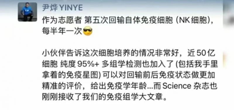 如今,抗衰早已不是中老年群体的专属议题,而被众多30+人群提上了人生的重要议程。 2025年11月,华大集团CEO尹烨在个人社交平台分享了一则动态,迅速引发广泛关注。作为科研志愿者,他完成了第五次自体NK免疫细胞回输,延续着每半年一次的免疫养护习惯。这让原本略显高端、神秘、小众的抗衰科技走进大众视野。