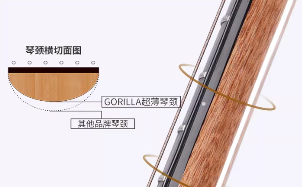 歌芮拉P20吉他的U型琴颈细节 细节工艺方面,P20采用全封闭式旋钮、骨质弦枕、玫瑰木指板等配置,这些细节虽不显眼,却直接影响吉他的音准稳定性和演奏舒适度。特别是琴颈的U型握感设计,薄型化处理,显著精简了传统琴颈的冗余厚度,精准适配女性、儿童及手型偏小用户,彻底解决了“琴颈过厚难以持握”的痛点,即使小手也能轻松环握、灵活按弦。同时,琴颈轮廓经过人体工学优化,在持握时能够自然贴合手掌曲线,虎口贴合度表现出色,有效缓解长时间演奏带来的手部疲劳与酸胀感。 用户体验:从“按弦疼痛”到“轻松上手” 对于初学者而言,最直接的体验感受往往来自“按弦是否费力”。P20在弦距调节、琴弦张力等方面做了针对性优化。