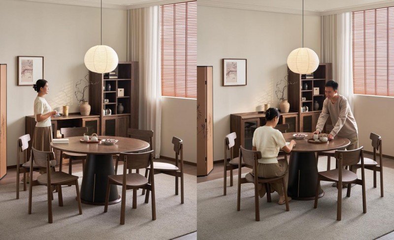 移山沙发提供常规款与电动款两种配置,电动款三个电机独立调节,贵妃、双人位、大床模式随意切换,多场景适用。进口头层牛皮面料,细腻亲肤,耐磨耐用。分段式靠背搭配拉点设计,头颈放松腰背贴合,内填微孔式高弹棉,舒适不落空。座包采用复合恒压高弹海绵,软弹有支撑。高颜值飞檐扶手设计,内嵌实木装饰,为空间注入中式雅致韵味。 拼花圆餐桌