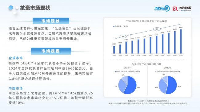 从古至今,健康与长寿始终是人类追求的永恒目标。从19世纪中叶到21世纪初,全球人口平均预期寿命突破性地从43岁快速攀升到了73岁。另据国家卫健委数据显示,中国居民人均预期寿命已达78.2岁,但人均健康预期寿命仅为68.7岁,即约十年带病生存。随着大众健康意识持续提升,越来越多的大众意识到寿命延长不等于生命质量提升,通过补剂来来提升健康预期寿命、减少年龄相关疾病发生已成为共识。 当前全球老龄化加剧,“延缓衰老”已从健康诉求升级为全民焦点。据WISEGUY报告,2024年全球抗衰老产品市场规模达2666亿美元,预计将以8%的复合增速持续扩张;而中国市场的增长则表现得尤为亮眼,年复合增长率近10%。这种显著的数据增长背后,折射出消费者对延缓衰老及整体健康维护的强烈需求。在此背景下,口服抗衰作为新兴市场,正在成为健康消费领域的重要增长极。