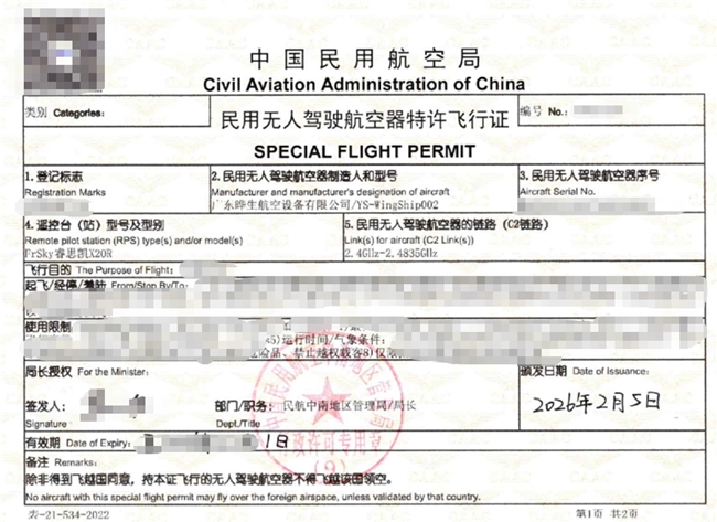 2026年2月5日,经中国民用航空局批准,晔生航空自主研发的“云翼WingWing、云舰WingShip”2款超轻型eVTOL正式获得特许飞行证。