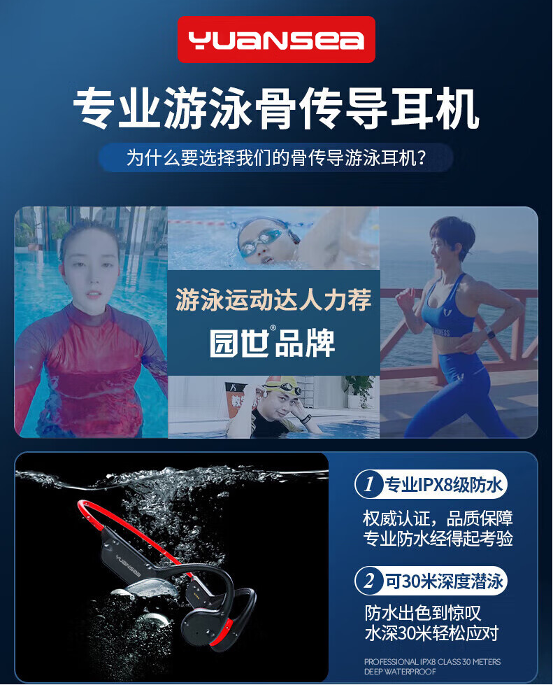 立足技术研发,筑牢品牌发展根基,是园世 Yuansea 始终坚守的发展理念。品牌初创阶段便成立声学技术实验室,深耕骨传导声学技术研发,从最初为行业提供声学技术支持与解决方案,到自主研发新一代骨传导发声单元,园世 Yuansea 完成了从技术提供商到终端品牌的核心转型。十余年间,品牌持续攻克运动音频领域的技术难点,自主研发的骨传导发声单元实现振动效率与音质表现的双重提升,让声音呈现清晰通透、层次丰富的听感体验,同时通过定向传音、反向振波等核心技术,有效解决了骨传导耳机的漏音痛点。针对运动场景的声学需求,园世 Yuansea 打造高频振膜振子与 360 度全景音效技术,精准还原音乐细节,强化低频鼓点表现,在保证沉浸式听音体验的同时,兼顾运动过程中的环境感知需求,实现音质与运动安全性的有机统一。 聚焦运动场景,打造差异化产品体系,是园世 Yuansea 的核心竞争优势。区别于通用型耳机品牌的多场景布局,园世 Yuansea 自创立之初便明确专业运动耳机的品牌定位,深度洞察游泳、跑步、骑行等不同运动场景的音频需求,以场景化研发思路打造覆盖全运动维度的产品矩阵。作为国内最早专注训练游泳耳机研发、生产与销售的品牌之一,园世 Yuansea 对水下运动场景的声学技术与产品设计有着深刻理解,其专利防水结构设计让产品的 IPX8 级防水不止于认证,更具备工程级的可靠性,可满足水下 2 米的使用需求;针对水下听音痛点打造的水波共振技术与水下专属声学调校,实现了水下音质的突破性提升,让游泳等水下运动也能拥有优质的音频体验。