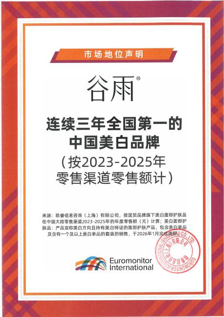 近日,中国护肤品牌谷雨在国际权威调研机构欧睿与沙利文的榜单中强势登顶,一举斩获“连续三年全国第一的中国美白品牌”及“累计五年国货美白护肤品全国销售额第一”两项重磅认证。这不仅夯实了谷雨在美白赛道的领跑地位,更成为国货崛起的标志性事件。 据悉,这两项基于2021年至今、覆盖全国范围的严谨数据认证,高度肯定了谷雨凭借“科研+原料”双轮驱动的成长路径。通过深耕原料自主创新,谷雨实现了从“跟跑”到“领跑”的弯道超车,其以硬核科技力赢得市场话语权的战略,正在收获来自权威机构和消费者的双重认可。