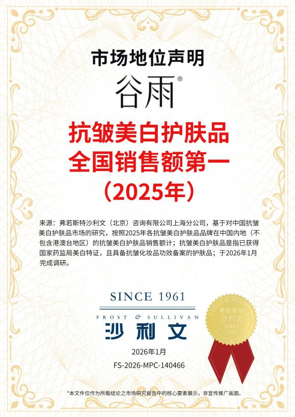 三重专利赋能 极光甘草奠定美白领先优势 在美白护肤领域,长期存在着两条截然不同的技术路线:一条是以侧重卷浓度功效的“化学猛药美白”路线,通过快速剥脱角质或抑制黑色素实现短期焕亮;另一条则是以天然植物提取物为核心的“安全植物美白”路线,追求在温和修护中实现长效美白。近年来,随着消费者对皮肤屏障健康的重视程度提升,“安全植物美白”正成为市场的主流选择——尤其是对于角质层更薄、更脆弱的亚洲人肤质而言。 特别是有公开研究资料显示,亚洲人的角质层相较于欧美人更薄,特别是表皮层整体更薄,因此对外界刺激更容易产生炎症反应。其中,中国女性敏感性皮肤的发生率约为36.1%——这意味着每三个中国女性中,可能就有一个以上为敏感肌。这决定了过往国际大牌基于欧美人皮肤肤质特点为科学开发框架的产品对于亚洲人而言可能存在不适应的情况。如何在呵护敏感肌肤不受刺激和破坏的情况下,同样获得显著的美白效果成为行业及品牌的研究方向。 在这一背景下,安全植物美白路线的价值被重新发现。其中,被誉为“美白黄金”的光甘草定,凭借其多通路抑制黑色素且自带舒缓消炎属性的双重优势,成为近年来跑出的最大“黑马”。第三方数据显示,光甘草定的美白效果是烟酰胺的140倍、原型维C的80倍,且温和不刺激,从根源上避免了“越白越红”的刺激困局。 而掌握这一成分定义权的品牌,正是谷雨。自品牌创立以来,谷雨在光甘草定领域持续深耕,拥有长达十八年的科研沉淀,并以超前的技术思路实现了对这一成分的全面突破。依托“熔融结晶提纯技术”这一专利,谷雨将光甘草定纯度提升至99%的行业天花板。针对光甘草定溶解性差、透皮率低而效果受限的行业难题,谷雨则通过另一自研专利“28纳米包裹技术”,通过仅为市面常见包裹体粒径1/3的超小包裹技术,实现成分透皮吸收率3.4倍的提升,真正解决了成分虽好却难以吸收的行业痛点。第三大专利“靶向递送技术”,则是通过精准识别抓取黑色素细胞表面独有的MC1R受体——这个受体正是国人皮肤中特别活跃的“致黑开关”——帮助高纯度成分高效送达。凭借这三大专利技术,谷雨推出了具备完全自主知识产权的美白原料——极光甘草,进一步稳固了其在光甘草定美白领域的开拓者与领导者地位。 值得注意的是,一些国际大牌虽然也在产品中添加光甘草定,但由于缺乏对这一成分的长期研究和深度沉淀,往往只是将其作为辅助复配成分。这就好比给燃油车加了一块电池,却没有配套的电动系统和能源生态,无法真正发挥其潜力。而谷雨对光甘草定的理解,远不止于“添加”层面——从源头种植(在新疆喀什自建光果甘草种植基地),到提纯工艺,到包裹递送,再到靶向识别,谷雨构建了一整套围绕光甘草定的技术生态系统。这种持续科研积累带来的突破,让谷雨重新定义了这一成分的纯度和起效机制。 持续发力“美白+” 领航抗皱美白新功效 在此次认证中,谷雨仅获得沙利文“连续三年全国美白第一的中国美白品牌”,更将“抗皱美白护肤品全国销售额第一”收入囊中。这意味着,谷雨正以“美白+”为核心支点,从单一功效的领跑者,加速成长为多效合一的引领者。