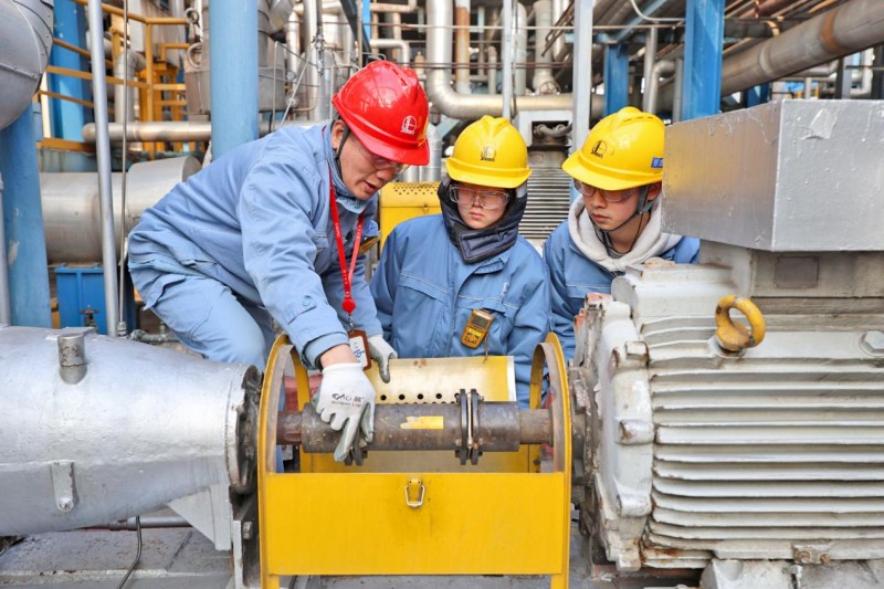 图为1月29日芳烃部管理人员向新员工传授备用设备维护知识。(李树鹏/摄 郭仕辉/文)