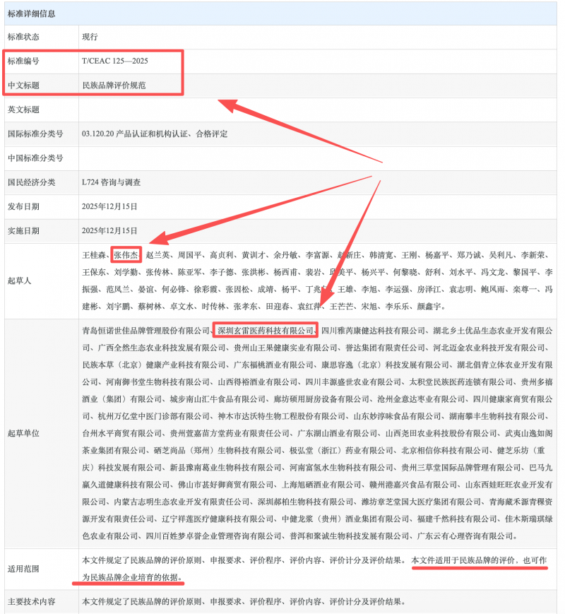 当一家企业从行业赛道里的“奔跑者”,变身成为赛道规则的“书写者”,这背后意味着什么? 近日,中国商业经济学会正式发布了《民族品牌评价规范》团体标准(T/CEAC 125---2025)。该标准旨在建立民族品牌科学评价体系,推动民族品牌高质量发展。值得关注的是,深圳玄雷医药科技有限公司(以下简称为玄雷医药)入选该标准主要起草单位名单,企业董事长张伟杰同时担任主要起草人。