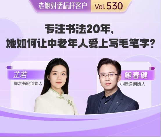 在当下社会追求精神富足、个体探索兴趣爱好的趋势中,小鹅通创始人鲍春健发起的《老鲍对话标杆客户》栏目始终聚焦客户实战经验,挖掘可复用的成长路径。本期特邀仰之书院创始人、山东省青年书协会员芷若老师,围绕 “专注书法 20 年,如何让中老年人爱上写毛笔字?” 展开深度交流。作为小鹅通生态中深耕兴趣领域的代表,芷若的案例不仅展示了个人从爱好者到创业者的转型,更凸显了小鹅通作为私域运营领域 SaaS 解决方案供应商的全链路赋能价值。通过一站式工具支持,小鹅通助力芷若高效搭建产品体系、运营私域用户,实现了 “小而美” 的长期主义事业。