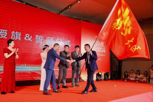 各大区总经理及分业务负责人接过旗帜,带领团队喊出铿锵有力的誓师口号,并郑重宣读年度目标。激昂的誓师响彻会场,展现了东融铁军势不可挡的锐气与众志成城的决心。