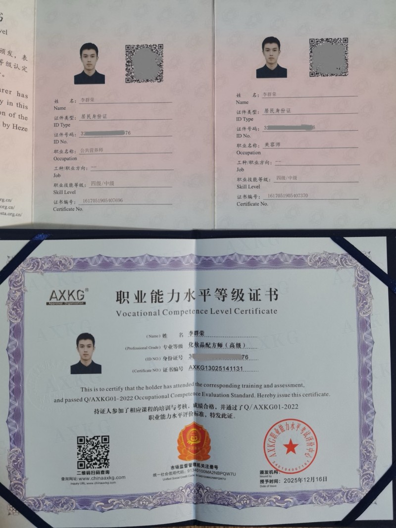 专业的服务,源于扎实的资质积淀。李群荣拥有公共营养师、美容师、化妆品配方师高级等多项专业资质,这些证书不仅是他专业能力的有力证明,更让他形成了“多维度、全视角”的护肤认知——打破单一护肤的局限,将营养管理、体质辨识与精准护肤深度融合,让护肤不再是表面的“修补”,而是由内而外的“调理”。