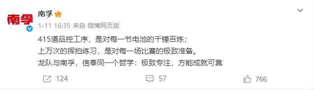 南孚电池官方微博的一段话,精准点出了品牌与马龙的精神共鸣:415道品控工序锤炼每一节电池,上万次挥拍打磨每一场比赛,二者信奉着同一个哲学——极致专注,方能成就可靠。这份对极致的执着,无关领域,无关荣誉,是深入骨髓的自我要求,也是各自成为行业标杆的核心底气。