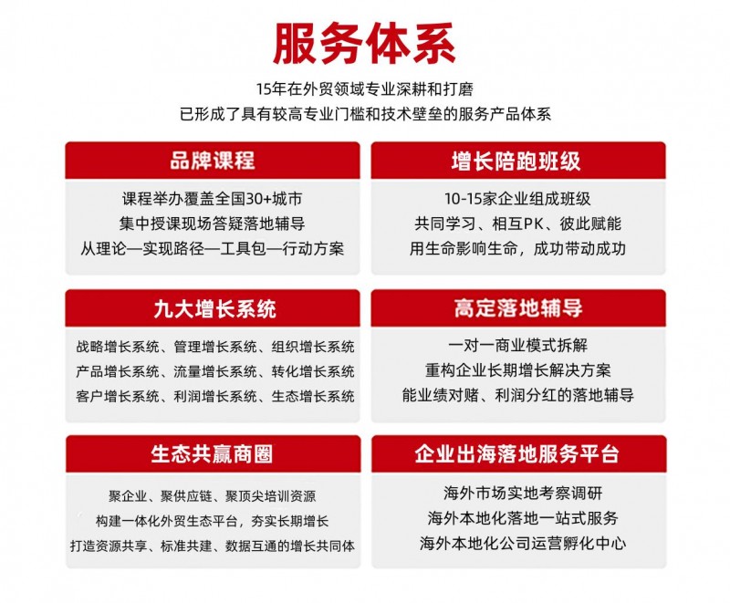 三、携手同行,智创未来:三汇助力外贸企业稳增致远 作为深耕外贸行业的实战赋能伙伴,三汇始终坚持“以落地为核心,赋能企业增长”的服务理念,多年来已帮助超6000家外贸企业实现业绩增长与管理升级。 依托多年的深耕积淀,三汇咨询构建了以企业增长为核心的多元化产品与服务矩阵,形成全链路增长赋能能力,为外贸企业提供覆盖增长全周期的专业支撑。三汇九大增长系统工程作为核心体系,以系统思维拆解外贸增长全链路,全面覆盖战略、管理、组织、产品、流量、转化、客户、利润、生态九大核心维度,为企业提供可视化、可执行的战略落地框架。