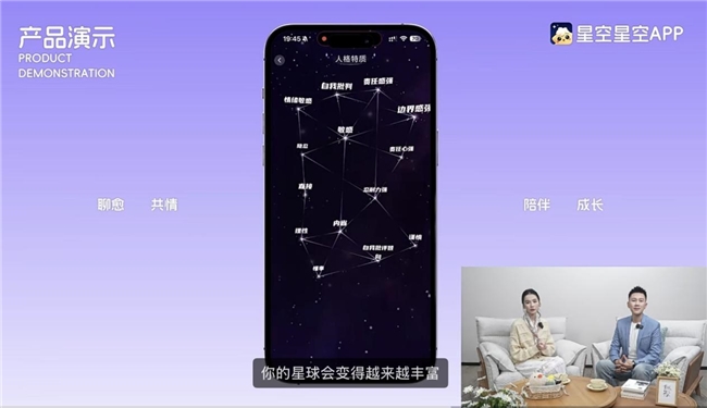 沉浸式场景演示 展示星云星空App核心功能 在发布会的核心环节,祝宁馨女士通过多段实景演示与界面操作讲解,带领直播间观众全方位了解星云星空App的核心功能。 根据现场展示,当用户进入星云星空App后,首先会遇到小助手「星宝」。在产品设计中,星宝被定位为用户在心理探索过程中的陪伴向导,根据用户当下状态提供合适的起点选择,例如开启一次与聊愈师南希的对话,体验心理小游戏,或通过心理课堂进一步理解自身情绪。 在深度对话体验展示中,发布会现场还演示了用户与AI聊愈师南希的对话过程。南希在对话中更强调情绪接纳与逐层探索,通过理解、共情与澄清,引导用户逐步看见情绪背后的原因与模式,而不是停留在表层问题。 发布会上还重点展示了星云星空App中的「记忆星球」。祝宁馨表示,这是对用户内在世界的一种可视化呈现。随着用户在App中的持续探索,个人专属的星球会逐渐生长变化,与南希每一次对话所沉淀下来的心理特质、思维模式和成长轨迹,也会被记录并呈现其中。借助这种方式,用户能够更直观地感知自身的变化,让原本难以察觉的心理成长拥有清晰痕迹,把那些无形的内在变化转化为可被看见的成长证据。