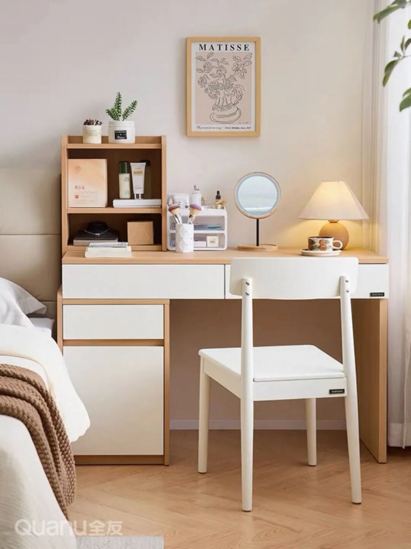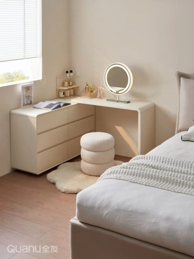 全友家居:129097转角柜 03梳妆台 与其单独放置床头柜+单独规划化妆区,不如直接用梳妆台替代床头收纳。在床边就能实现化妆、护肤、收纳一体化,从起床护肤到日常储物一步到位,省心又省空间。