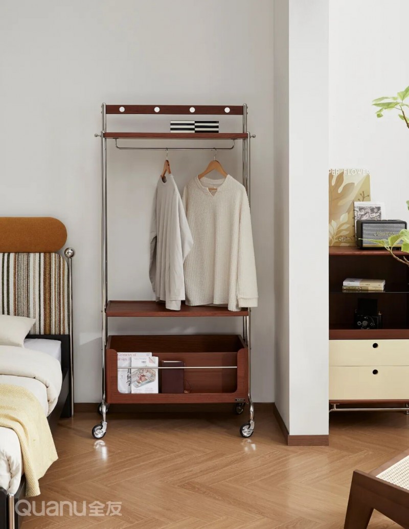 全友家居:600919装饰架 06移动衣帽架 床边需要临时挂放衣物、包包,又需要灵活调整卧室布局?在床头添置一个移动衣帽架就能搞定。 它可随意移动到床头位置,实现挂衣置物一体,不用时还能挪到卧室其他区域,灵活适配各种使用场景。