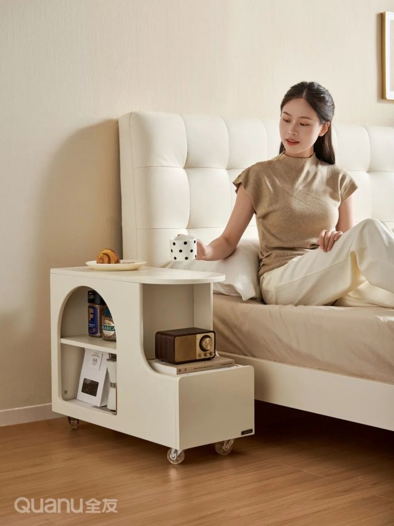 全友家居:810756移动穿衣镜 07移动边几 传统床头柜不仅笨重占地,还容易积灰形成卫生死角,移动边几却能巧妙化解这些烦恼。 打扫时轻轻一推即可移开,日常清洁更省心;小巧台面可随手放置水杯、手机和睡前读物,随放随取超灵活;不用时,还能移到客厅、阳台当小茶桌,轻松实现一物多用。